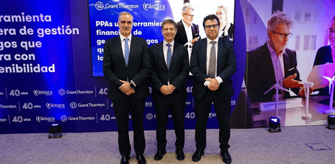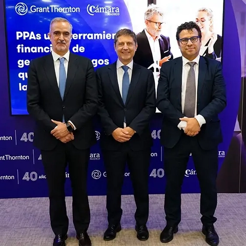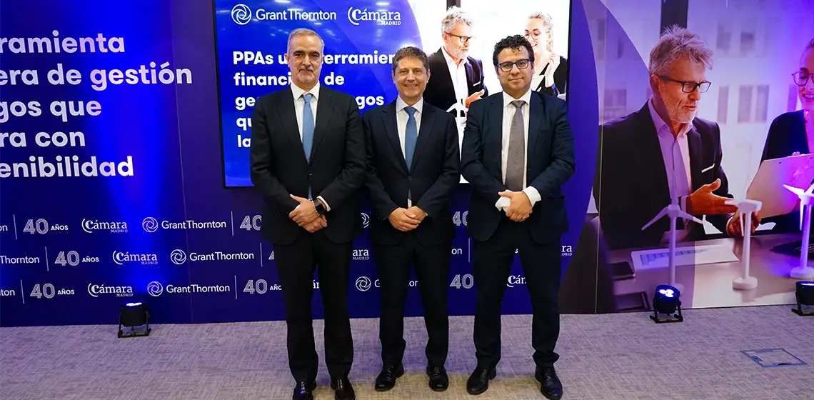 El evento, organizado por Grant Thornton y la Cámara de Madrid, reunió a destacados expertos para explorar el papel de los PPAs en la transición energética mediante las intervenciones de: José Manuel López, socio de Auditoría y Assurance No Financiero en Grant Thornton, Eduardo Tapia, Socio de Fiscal y Fernando Herrero, socio de Valoraciones de Instrumentos Financieros de la firma.