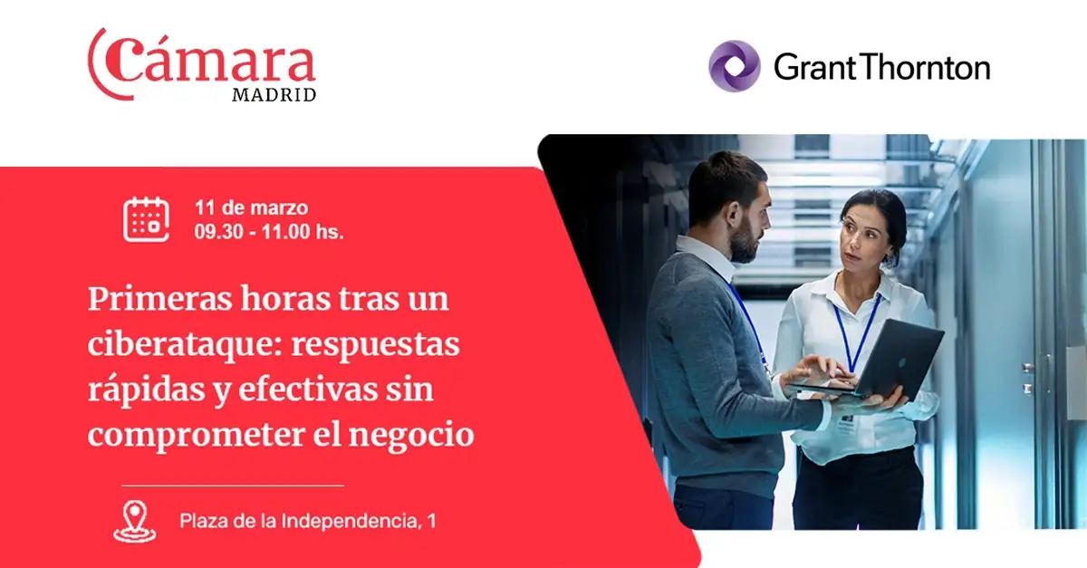 Grant Thornton organiza, junto a la Cámara de Comercio de Madrid, un desayuno centrado en la gestión de crisis derivadas de ciberataques y en cómo responder con rapidez, rigor y coherencia sin poner en riesgo la continuidad del negocio, de la mano de nuestra socia experta en ciberseguridad, Cristina Muñoz Aycuens.