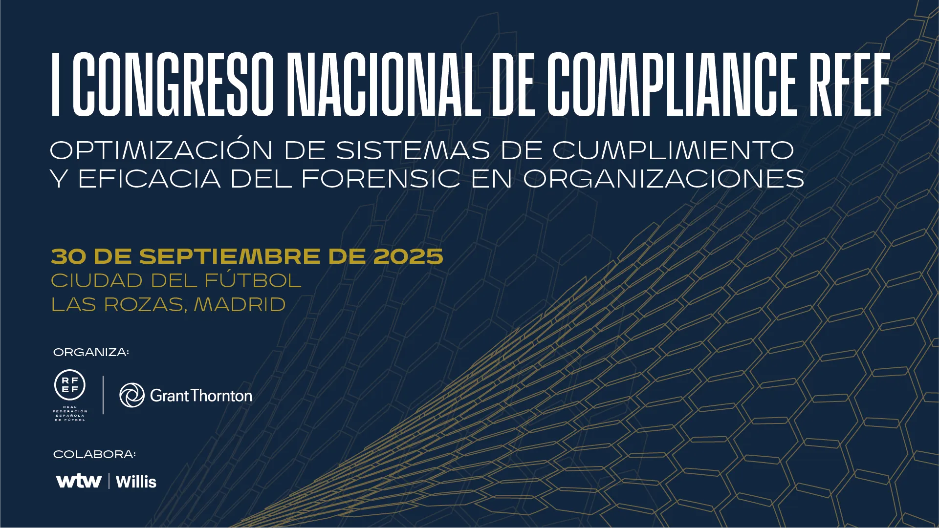 Grant Thornton organiza junto a la Real Federación Española de Fútbol el I Congreso Nacional de Compliance RFEF; un encuentro que se convertirá en el epicentro del Compliance & Forensic el próximo día 30 de septiembre. Un Congreso de excelencia formativa centrado en la ejecución óptima de Sistemas de Compliance y Sistemas Internos de Información dentro de las organizaciones deportivas y empresariales