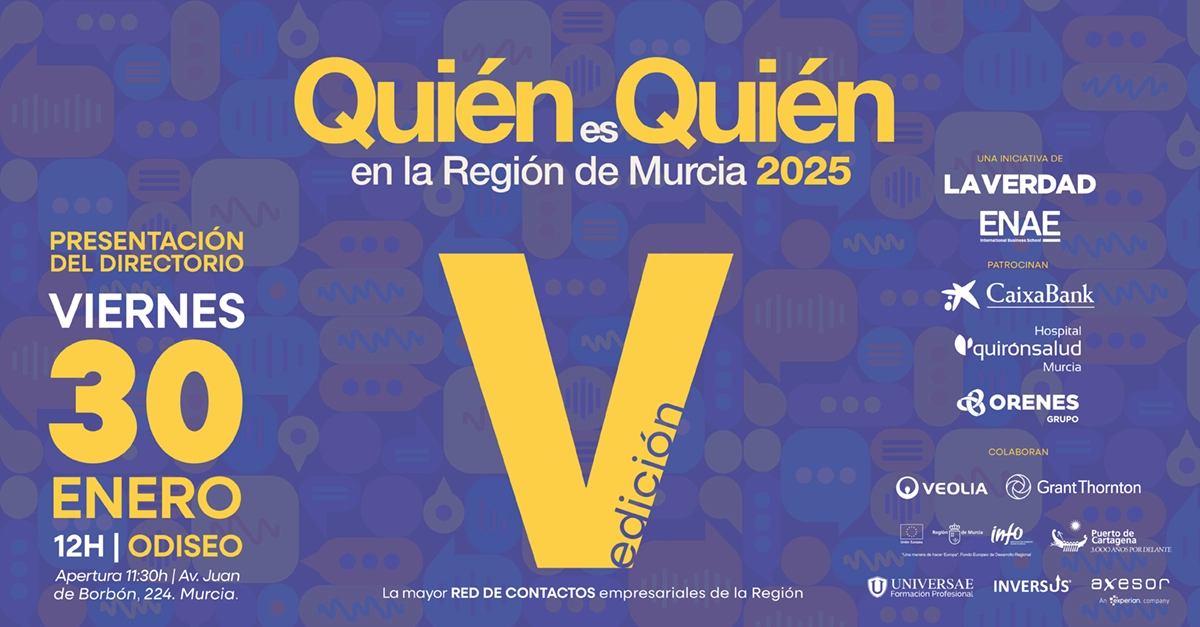 Esta quinta edición de Quién es Quién Murcia reúne información actualizada y contrastada de pymes y grandes empresas de la Región de Murcia, reforzando el rigor y la fiabilidad de los datos empresariales publicados. El directorio es el resultado de la producción conjunta y coordinada de LA VERDAD y ENAE Business School, que renuevan su colaboración tras la buena acogida de las ediciones anteriores.