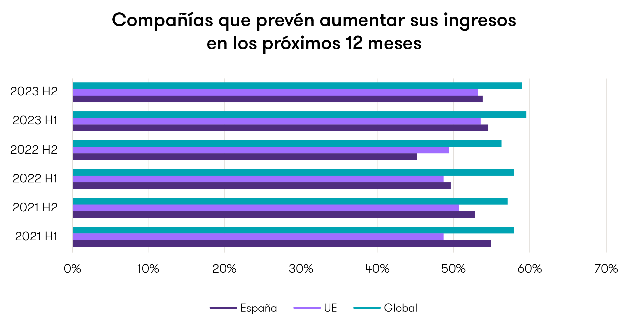 Ramón Galcerán, presidente de Grant Thornton en España: “Las empresas españolas son moderadamente optimistas con respecto a su futuro, lo cual siempre resulta alentador. Más de la mitad de ellas confían en ver incrementados sus ingresos en los próximos doce meses, y el 48% considera que también lo hará su rentabilidad. Sin embargo, han de enfrentar grandes retos, como un contexto internacional muy inestable, una incertidumbre económica que no cesa y un escenario regulatorio complejo. Por tanto, debemos estar muy atentos a estos desafíos macroeconómicos para ver si la tendencia optimista continúa en los próximos meses”.
