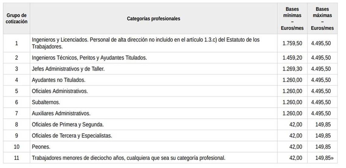 - El tope máximo de cotización para todos los grupos profesionales será de 4.495,50 €, siguiendo los siguientes importes: