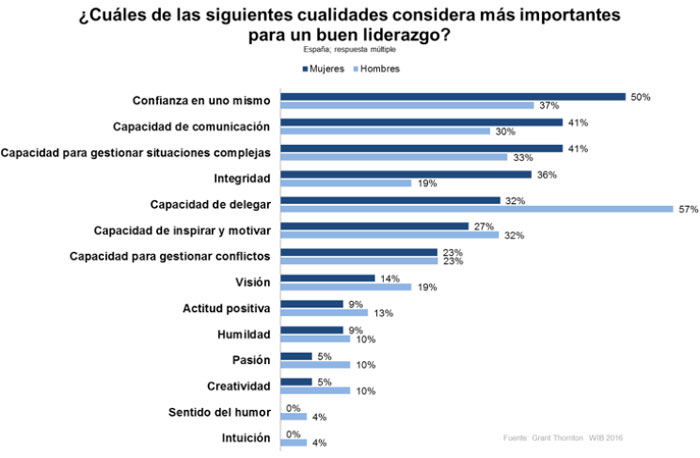 Por el contrario los hombres señalan como principal cualidad del buen liderazgo la capacidad de delegar (mencionada por un 57%) mientras que sólo un 30% considera importante la capacidad de comunicación. Resulta también notable la diferencia a la hora de valorar la integridad, que siendo la cuarta cualidad más mencionada por las mujeres (36%), ocupa la séptima posición en el caso de los hombres (19%).