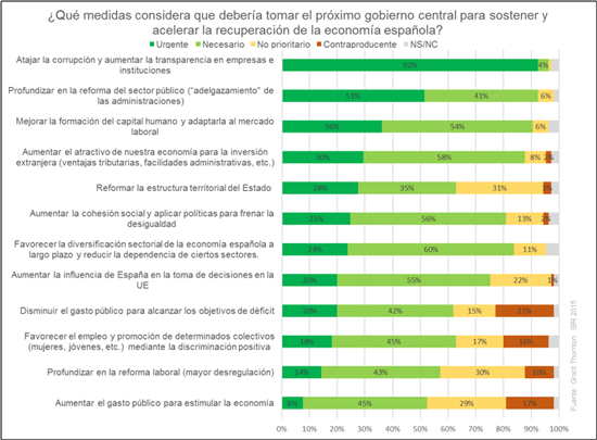 Esta es una de las principales conclusiones del último International Business Report de Grant Thornton, en el que 100 directivos de empresas españolas medianas y grandes dieron su opinión, durante las semanas previas a las elecciones generales, sobre las principales medidas a tomar por el próximo gobierno en torno a dos áreas: la recuperación económica y el crecimiento empresarial.