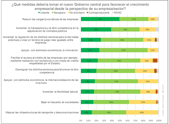Los directivos muestran un menor consenso en cuanto a qué medidas políticas resultan prioritarias para el crecimiento de sus propias compañías o sectores. La más demandada es la reducción de las cargas burocráticas que afrontan las empresas, considerada urgente por la mitad de los encuestados. Le sigue el aumento de la transparencia en la contratación pública, un asunto prioritario para el 39%.