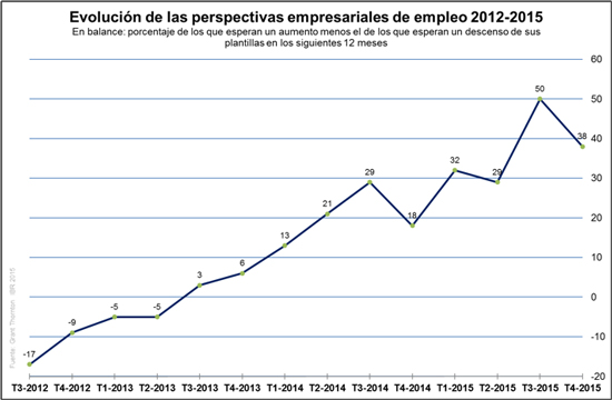 Si bien en la mayoría de indicadores se mantiene la tendencia positiva iniciada a finales de 2014, en el caso del empleo las previsiones sufren un pequeño bache respecto al trimestre anterior. El porcentaje de líderes empresariales que esperan aumentar su plantilla en el próximo año baja nueve puntos para situarse en el 45% mientras que el de los que prevén despidos aumenta tres puntos hasta el 7%. El resto, un 49%, cree que su plantilla se mantendrá en los niveles actuales.