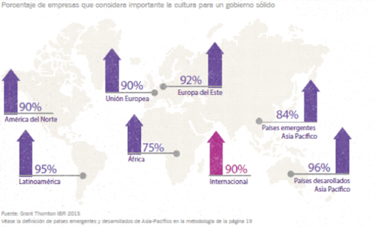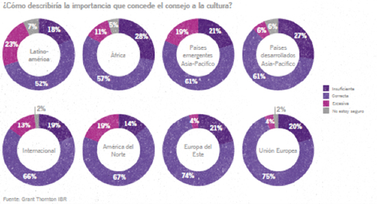 Prácticamente la totalidad de los encuestados en España, un 95%, considera que la existencia de una cultura empresarial propia resulta importante para conseguir un gobierno corporativo consistente. Sin embargo, un 30% piensa que su consejo de administración no presta la suficiente atención al desarrollo de dicha cultura frente a un 58% que considera que la atención es adecuada y un 13% que cree que es excesiva.