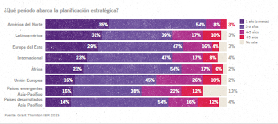 El porcentaje de empresas españolas con planes a cuatro o más años, un 30%, se sitúa ligeramente por debajo de la media de la eurozona, un 36% que la convierte en la región con una visión estratégica a más largo plazo. En el lado opuesto, con tan sólo un 12% de empresas con una estrategia de largo recorrido, se sitúa Norteamérica.