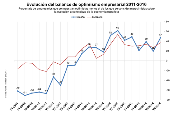 Los datos, recogidos tras la formación de Gobierno a finales de octubre, son los mejores de un 2016 en el que la incertidumbre política ha lastrado la confianza empresarial. El balance de optimismo resultante (optimistas menos pesimistas), de 47 puntos, sitúa a España por encima de la media de la eurozona (37 puntos) y sólo por detrás de Alemania (59 puntos) entre las cuatro grandes economías de la unión monetaria.