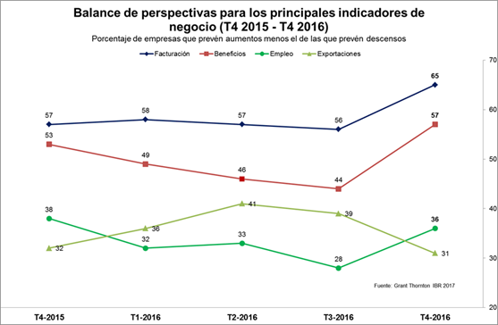 El 2017 será otro año de crecimiento para las empresas españolas medianas y grandes. Al menos así lo vaticinan los directivos encuestados en el International Business Report de Grant Thornton que recoge las previsiones para el nuevo año de más de 2.600 empresas en 37 economías de todo el mundo (100 en España).
