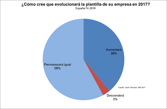 Las previsiones de empleo también mejoran respecto a trimestres anteriores. Un 39% de los directivos encuestados en España cree que sus empresas aumentarán la plantilla en 2017 frente a sólo un 3% que prevé despidos. La mayoría, un 58% piensa que se mantendrán los niveles de empleo actuales.