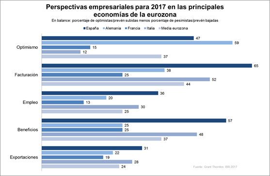 Entre las cuatro grandes economías de la eurozona, los empresarios españoles son los que más esperan de 2017 en cuanto a facturación, empleo, beneficios y exportaciones. Los empresarios alemanes superan a los españoles en optimismo (59 puntos frente a 47) pero en el resto de parámetros sólo Italia se acerca tímidamente a las buenas previsiones españolas.