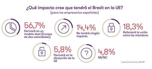 Los principales datos que arroja la encuesta dejan claro, sin embargo, que los líderes empresariales europeos ya no temen al Brexit ni creen que sea una amenaza existencial para la Unión Europea. Sólo 1 de cada 10 considera que derivará en una disolución del proyecto europeo. Aunque la mayor parte de directivos encuestados sí esperan otros efectos. Como, por ejemplo, que el proceso acelere un modelo de Europa a dos velocidades; un 38% de empresarios europeos así lo creen, una opinión que sostiene el 40% de empresarios británicos, el 42% de alemanes y que se dispara hasta el 57% entre los directivos españoles. En contraste, sólo un 18% de empresarios españoles creen que el Brexit reforzará la unión entre los miembros restantes del club europeo.