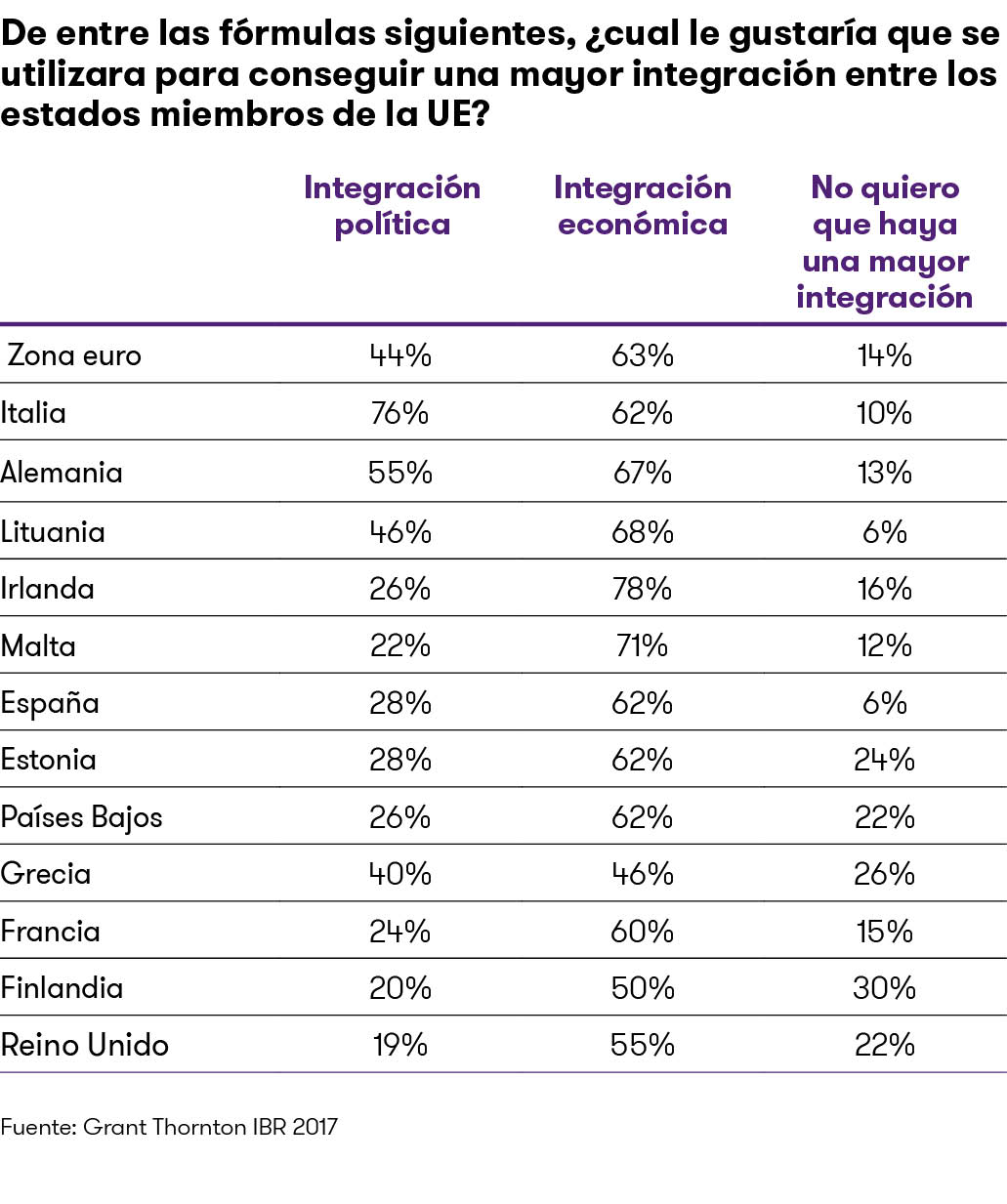 reguntados por si prefieren más economía o más política, los empresarios españoles lo tienen claro. Un 62% apuesta por aumentar la integración económica frente a un 28% que quiere más integración política y un 10% que no quiere más integración europea de ningún tipo. Estas cifras son muy parecidas a la media de la Eurozona, que apostaría en un 63% por la integración económica frente a un 44% que prefiere integración política. Incluso los empresarios del Reino Unido, país en pleno proceso de abandono, apostarían en un 55% por más cooperación económica frente a un 19% que prefiere más integración política o un 22% que no desearía ninguna fórmula adicional de convergencia con Europa.