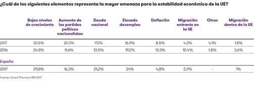 “Si analizamos el entorno geopolítico en su conjunto, y tras la reciente derrota de Marine Le Pen en Francia, la extrema derecha puede que aún no haya alcanzado el poder en Europa, pero los populismos sin duda han echado raíces. Además, muchas empresas reconocen la amenaza que ahora constituye la oleada de proteccionismo que podría minar el comercio, los flujos de capitales y los movimientos migratorios. Los países atraviesan un contexto de profundos cambios políticos y los países que podrían verse más afectados si las negociaciones del Brexit no prosperan se muestran especialmente preocupados”, según apuntaÁlvaro Sanmartín, Jefe Económico de Grant Thornton y asesor del Fondo Alinea Global.