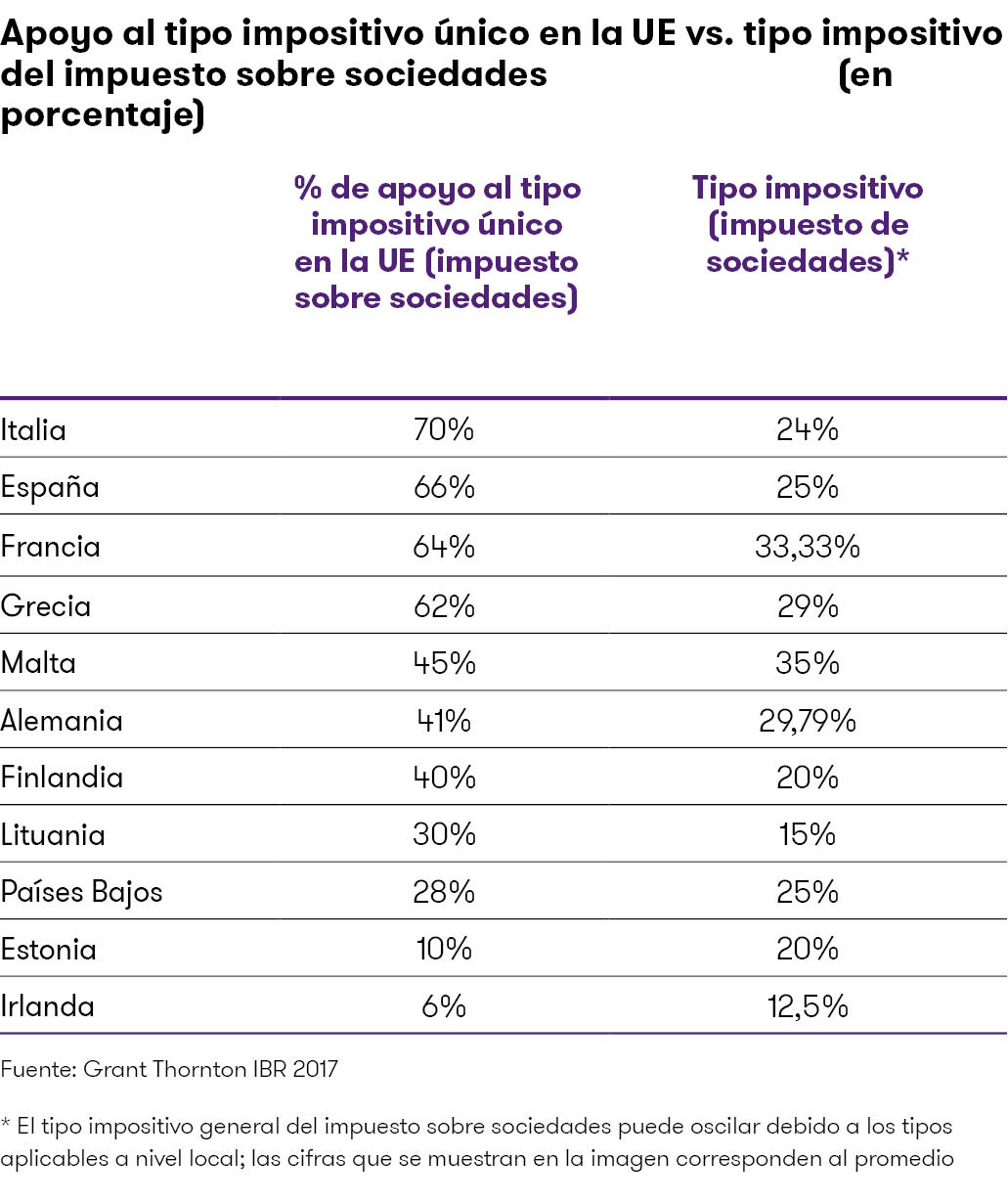Por último, el nuevo informe sobre la Unión Europea de Grant Thornton apunta que una mayoría de empresas europeas (53%) apoyaría la implantación de un tipo único europeo del impuesto sobre sociedades. El estudio muestra que el apoyo es especialmente fuerte entre los directivos de España (66%), Italia (70%), Francia (64%) y Grecia (62%), países en donde los tipos impositivos son superiores a la media europea.