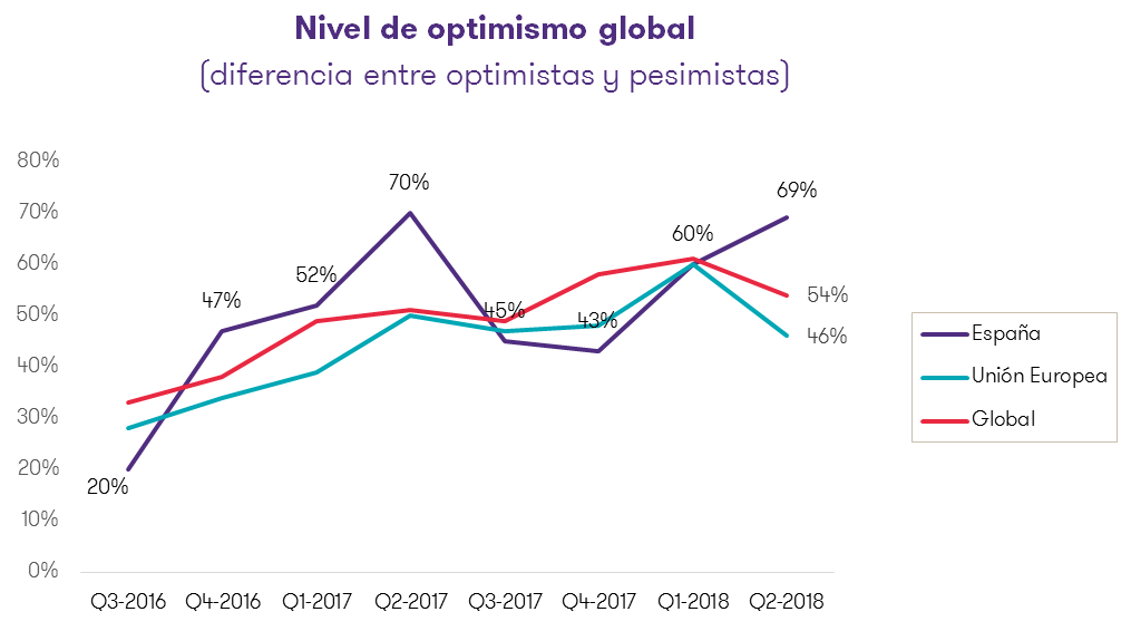 Tras la caída de 27 puntos en los niveles de confianza experimentada en el último semestre de 2017, por la incertidumbre derivada de las tensiones territoriales y políticas en España, el primer semestre de 2018 ha visto cómo el optimismo volvía a las empresas y se recuperaba de forma igualmente rápida, pasando del 43% registrado a finales del año pasado al 69%. De esta forma, los empresarios españoles se sitúan entre los más optimistas de la zona Euro, solo por detrás de holandeses, austriacos y alemanes.