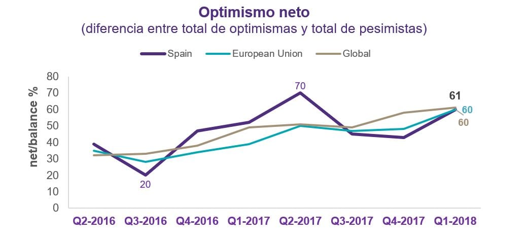 En la misma línea mejoran las previsiones de beneficios empresariales, volviendo a máximos con un 61% neto, 17 puntos más que el trimestre anterior, muy por encima de la media europea (40%), donde solo los empresarios irlandeses esperan generar más beneficios (62%), y de la global (44%). En cuanto a las expectativas de contratación, estas se mantienen estables habiendo recuperado 8 puntos con respecto al último trimestre de 2017 y volviendo a niveles de los últimos tres años.