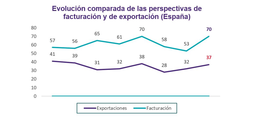 La confianza en las perspectivas de negocio va acompañada, en el caso de los empresarios españoles, de unas mejores perspectivas de facturación en los próximos doce meses, volviendo a niveles de 2017 y alcanzando los 70 puntos (record de la serie histórica), con un alto porcentaje que sigue confiando en la fortaleza de las exportaciones; solo los holandeses muestran más confianza en este sentido.