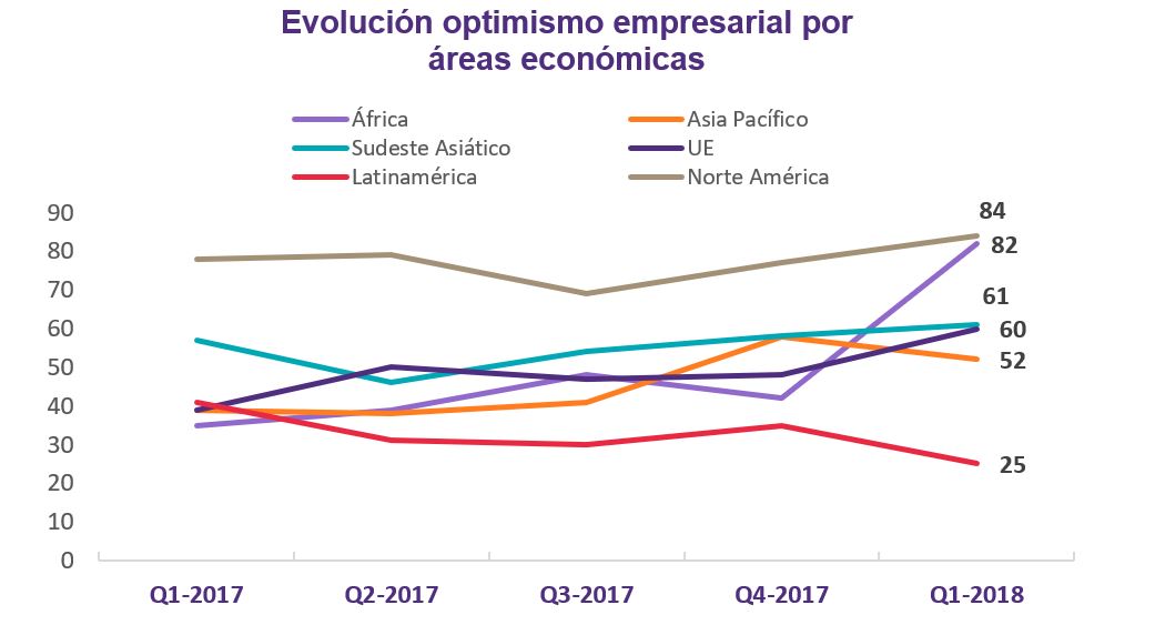 La recuperación de la confianza ser produce en todas las regiones analizadas. La Unión Europea crece 12 puntos, mientras que Estados Unidos añade 7 y alcanza máximos históricos (89%); el sudeste asiático alcanza el 61%, lo que es la mayor cifra en siete años; y solo Latinoamérica parece caer en un estado más pesimista de sus empresarios, al caer 10 puntos en un trimestre y quedarse en el 25% neto.