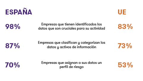Otra muestra de la concienciación de las empresas españolas en relación con la seguridad de sus datos es que no solo ubican esa información clave para el negocio, sino que la práctica totalidad (86,7%) afirma tenerlos clasificados y categorizados por tipo de datos (financieros, de clientes, etc.). De nuevo los directivos españoles encuestados destacan por encima de la media de la UE (73,1%) y de sus homólogos de Holanda (74,6%), Reino Unido (73,7%), Irlanda (63,8%) o Alemania (54%), entre otros.