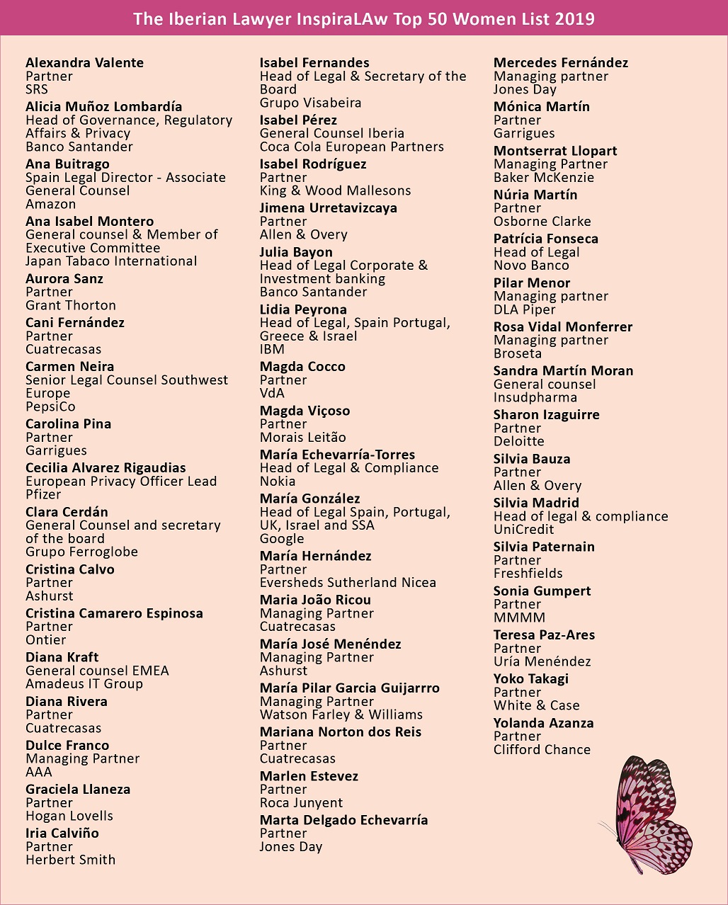 La clasificación de las 50 abogadas más inspiradoras en España y Portugal de 2019 incluye profesionales internos de Google, Amazon, IBM y PepsiCo, así como socios y directivos de las firmas y despachos más punteros de España y Portugal. Para la configuración del ranking, se ha consultado a más de 1.000 letrados y juristas, que han dado su voto y opinión, proponiendo sus candidatas de forma directa.