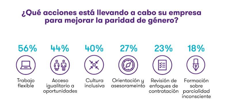 Para lograr este avance, los directivos y directivas encuestadas explican que han reforzado las políticas de diversidad de género en sus corporaciones. Entre las más importantes destacan el trabajo flexible (56%); el acceso igualitario a oportunidades laborales (44%) y la creación de una cultura de empresa más inclusiva y diversa (40%)