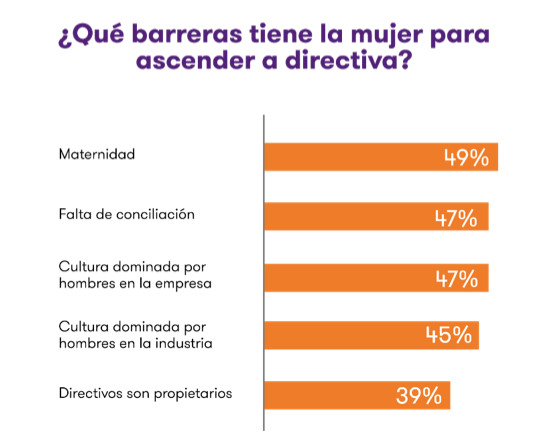 Sin embargo, la maternidad (49%), la falta de conciliación (47%) y una cultura dominada por hombres en su sector (47%) y en su propia empresa (45%) siguen siendo las principales barreras que frenan a la mujer en su desarrollo directivo.