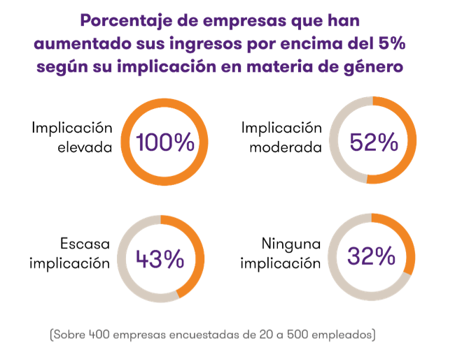 La conclusión es clara: a mayor implicación en materia de género, mayor probabilidad de haber crecido a ritmos superiores al 5%. Solo una de cada tres empresas sin implicación ha crecido por encima de ese porcentaje. En cambio, el 52% de las empresas “moderadamente” implicadas ha aumentado sus ingresos por encima del 5%. Por último, las pocas empresas del estudio (1%) con un compromiso alto en paridad han incrementado todas significativamente su rentabilidad en 2018.