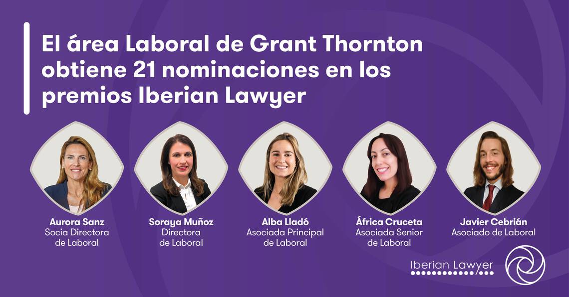 El área laboral de Grant Thornton demuestra un año más su liderazgo y capacidades en el mercado jurídico español en una nueva edición de los premios Iberian Lawyer. La firma aglutina un total de 21 nominaciones, 10 de ellas colectivas y 11 individuales, donde destacan un total de cinco profesionales pertenecientes al departamento liderado por la Socia Directora de Laboral Aurora Sanz.