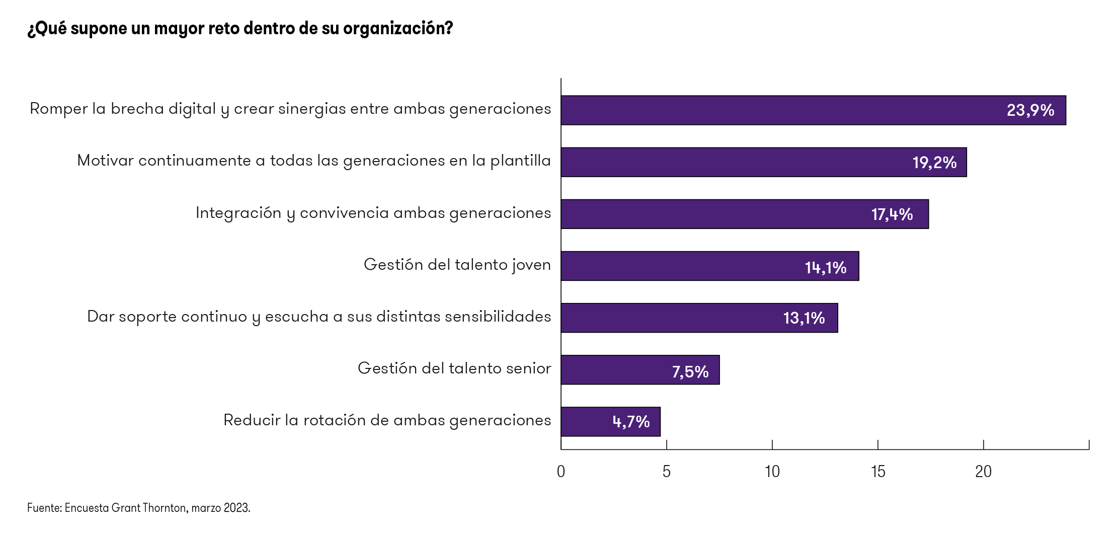 No obstante, esta no es una tarea sencilla. Consultados sobre el mayor reto que se encuentran dentro de la organización, el 23% de los directivos españoles indica que romper la brecha digital y crear sinergias entre generaciones constituye el principal desafío, por delante del 19% que considera como gran reto motivar continuamente a todas las generaciones de la plantilla. Le sigue con el 17% la integración y la convivencia entre las generaciones, la gestión del talento joven (14%) y la necesidad de contar con un soporte continúo y de escucha para detectar distintas sensibilidades entre los colectivos (13%).