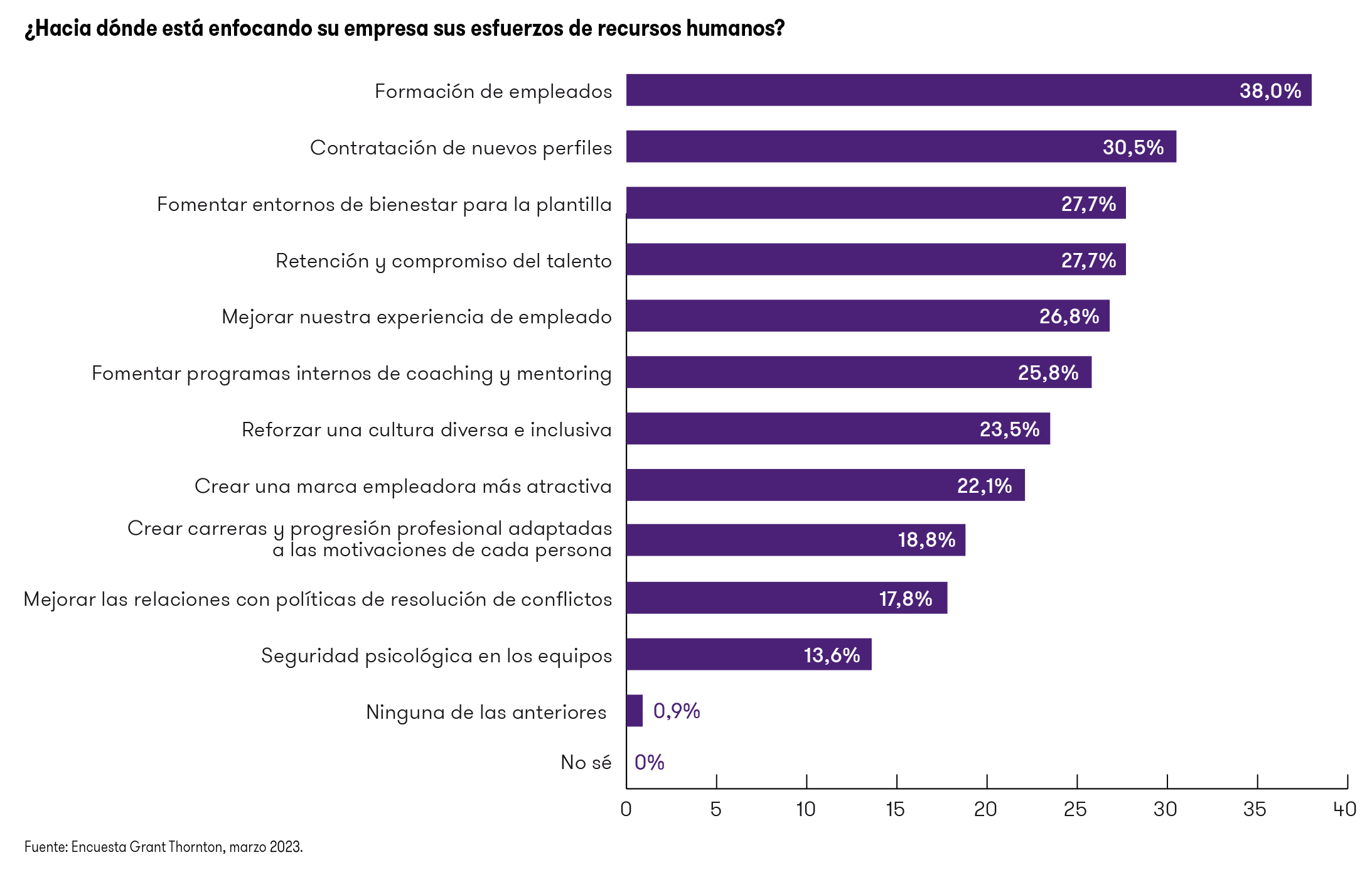Ante la escasez de talento joven, los resultados obtenidos muestran que los esfuerzos de los departamentos de Recursos Humanos de las empresas españolas se están orientando en dos direcciones principales. El 38% de las empresas consultadas afirma estar fomentando la formación de sus empleados, mientras que el 30% asegura estar contratando nuevos perfiles. En un escalón inferior se sitúan las políticas para fomentar entornos de bienestar para la plantilla, así como la retención y el compromiso del talento (ambos con el 27%) y el fomento de programas internos de coaching y mentoring. (25%).