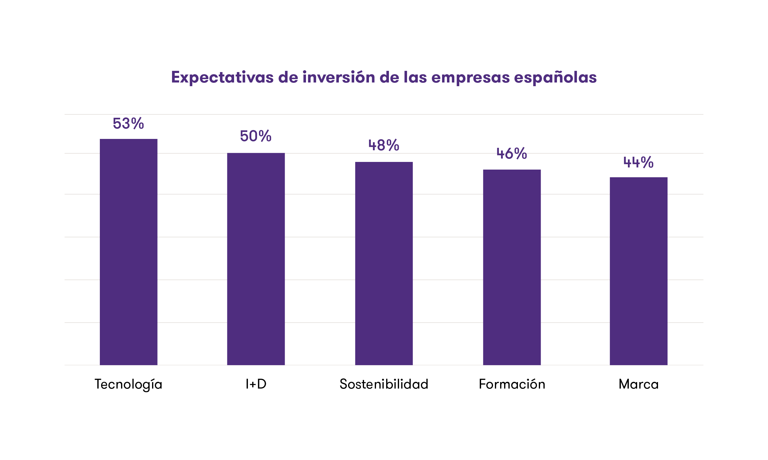 La tecnología se ha convertido en un elemento imprescindible para los directivos a la hora de diseñar sus estrategias de futuro. De hecho, una de cada dos compañías españolas (50%) espera impulsar sus estrategias en I+D en los próximos doce meses, la tasa más alta de los últimos años y que se incrementó en doce puntos con respecto a la última edición del estudio. Además, más de la mitad (53%) tienen previsto en invertir en tecnología, una intención que tampoco han dejado de crecer en las últimas entregas.