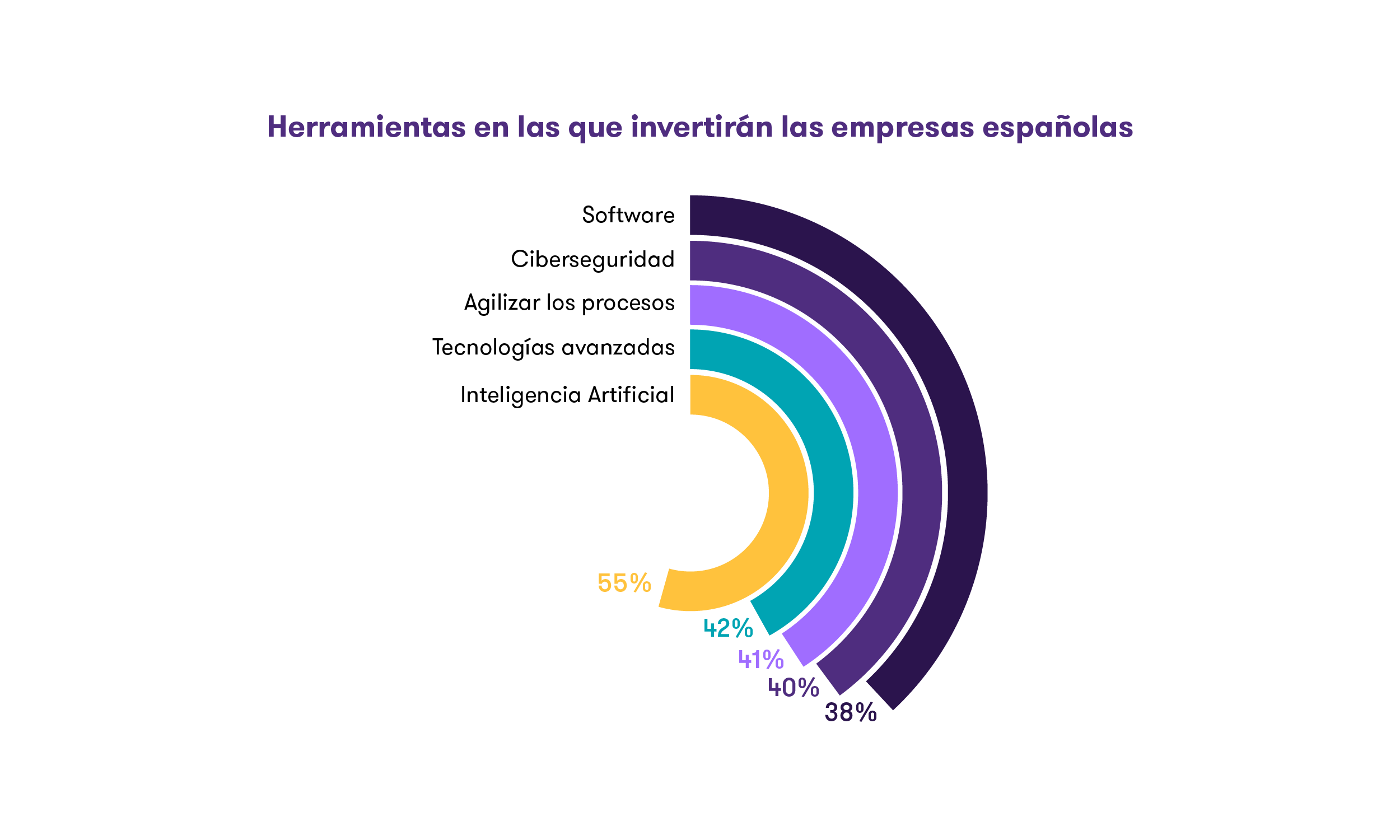 En materia tecnológica y más allá de la Inteligencia Artificial, las compañías tienen previsto dedicar esfuerzos a la aplicación de tecnologías avanzadas (elegida por el 42%), al uso de herramientas que agilicen los procesos (41%) y en cuarto puesto, la ciberseguridad (40%), una apuesta que se encuentra por debajo tanto de la media de la UE (45%) y como del porcentaje global (54%).