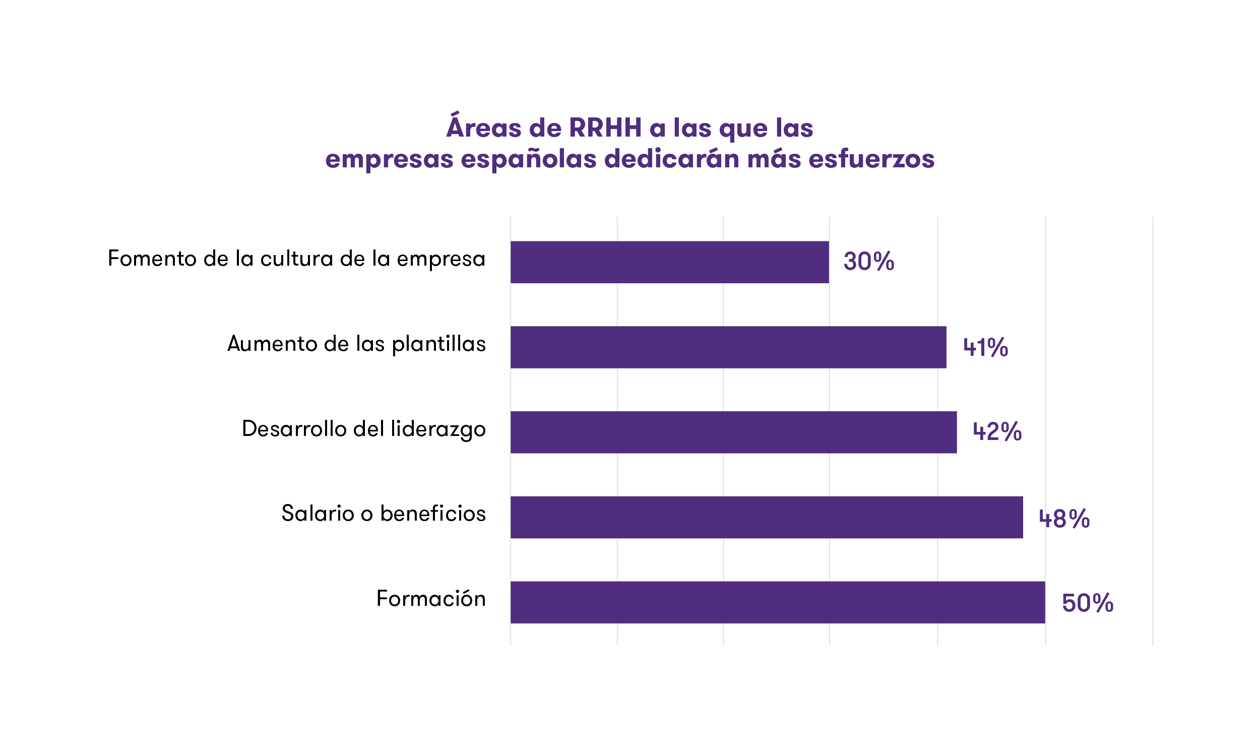 La formación es elegida por la mitad de las organizaciones de nuestro país como el área prioritaria de Recursos Humanos a la que dedicar esfuerzos, seguida por el incremento del salario o de los beneficios (48%), el desarrollo del liderazgo (42%), el aumento de las plantillas (41%), o el fomento de la cultura de empresa (30%).