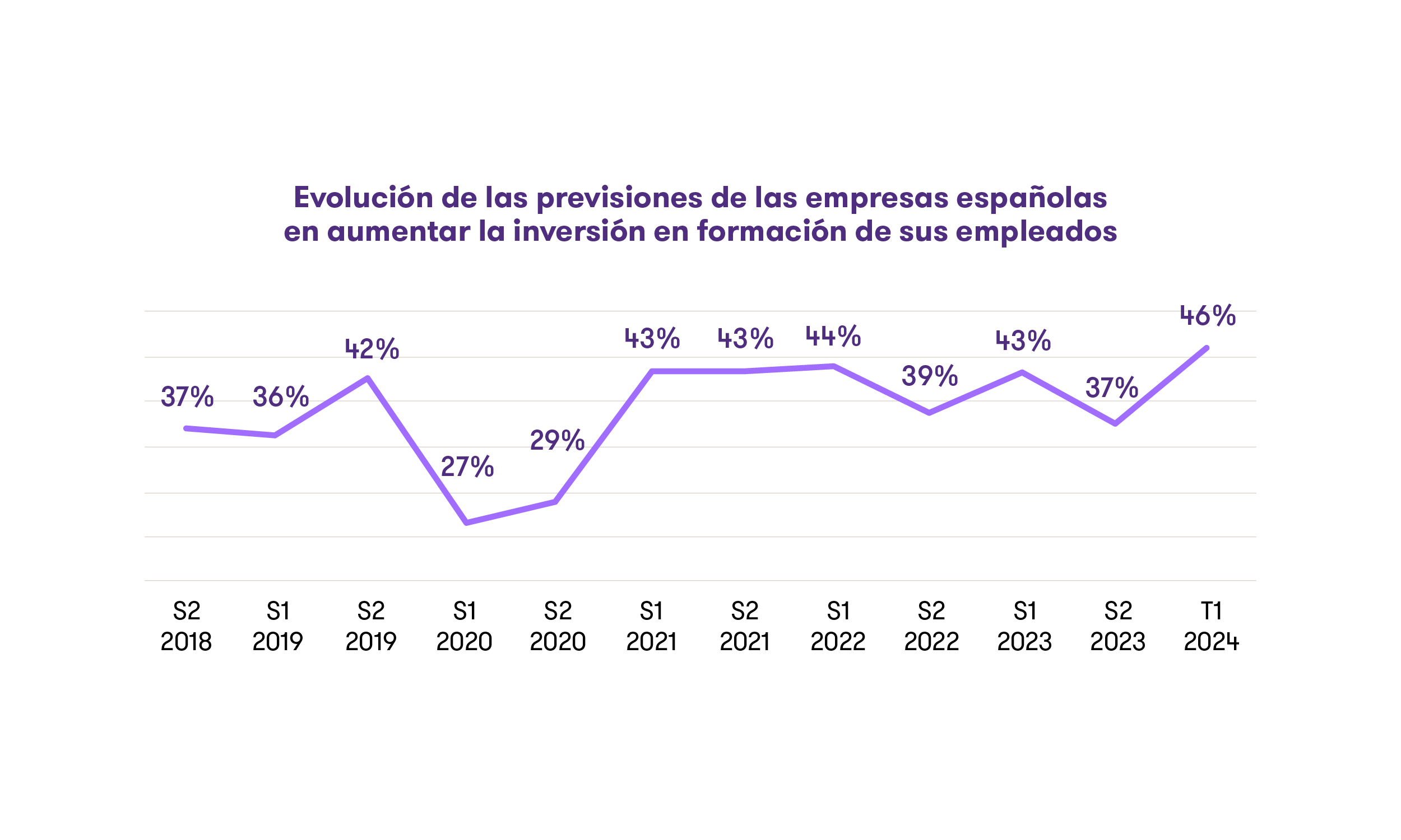 Por otro lado, cerca de la mitad de las compañías españolas (46%) esperan aumentar su inversión en formación para sus empleados. Estas previsiones se han incrementado en nueve puntos porcentuales con respecto a la última edición del IBR y es la tasa más alta desde que existen datos de este indicador, lo que denota la creciente importancia de que las competencias de los profesionales se ajusten a las tendencias del mercado, en especial en lo relacionado con las nuevas tecnologías.