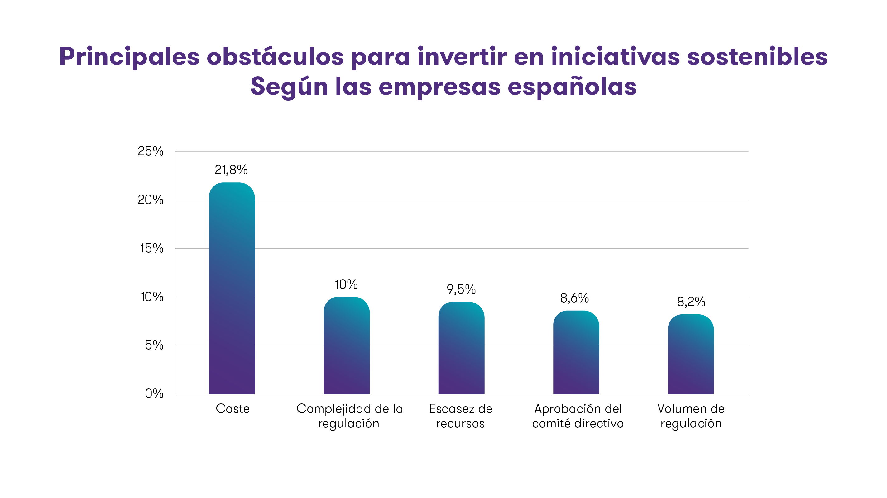 Respecto a las barreras, el análisis refleja que el 21,8% de las compañías españolas identifica los costes como el principal freno para avanzar en sostenibilidad, un porcentaje casi 4 puntos superior al registrado en la media de la UE y el conjunto global.