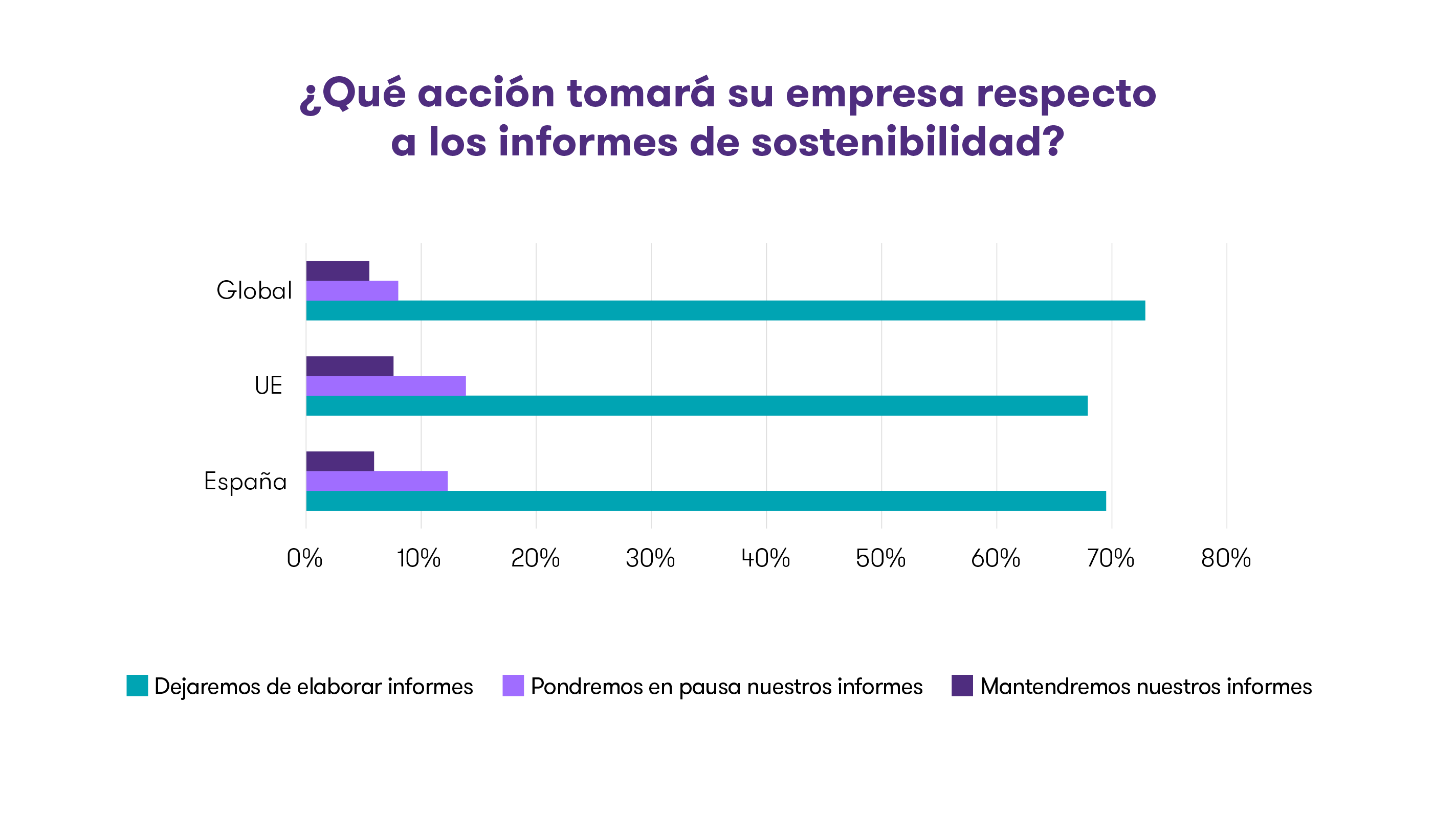 La realidad es que las empresas españolas siguen apostando por la publicación de informes vinculados a la sostenibilidad y los vaivenes regulatorios no han variado esta estrategia. Un 69,5% de los encuestados asegura que mantendrá sus informes, ya sea por su sentido empresarial (34,1%), por estar alineados con su propósito empresarial (24,1%) o por haber completado prácticamente estos reportes (11,4%). Se trata de un resultado que supera los registros del conjunto de la Unión Europea (67,9%) y que se sitúa ligeramente por debajo de los resultados globales (72,9%), donde el impacto de los cambios en la directiva CSRD están más difuminados.