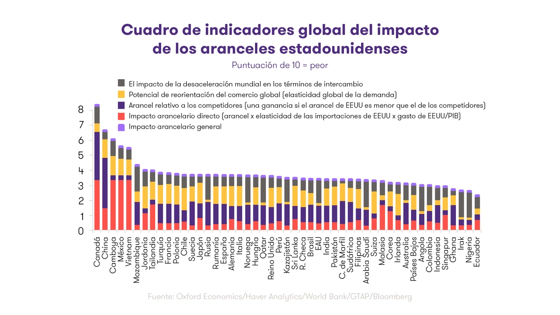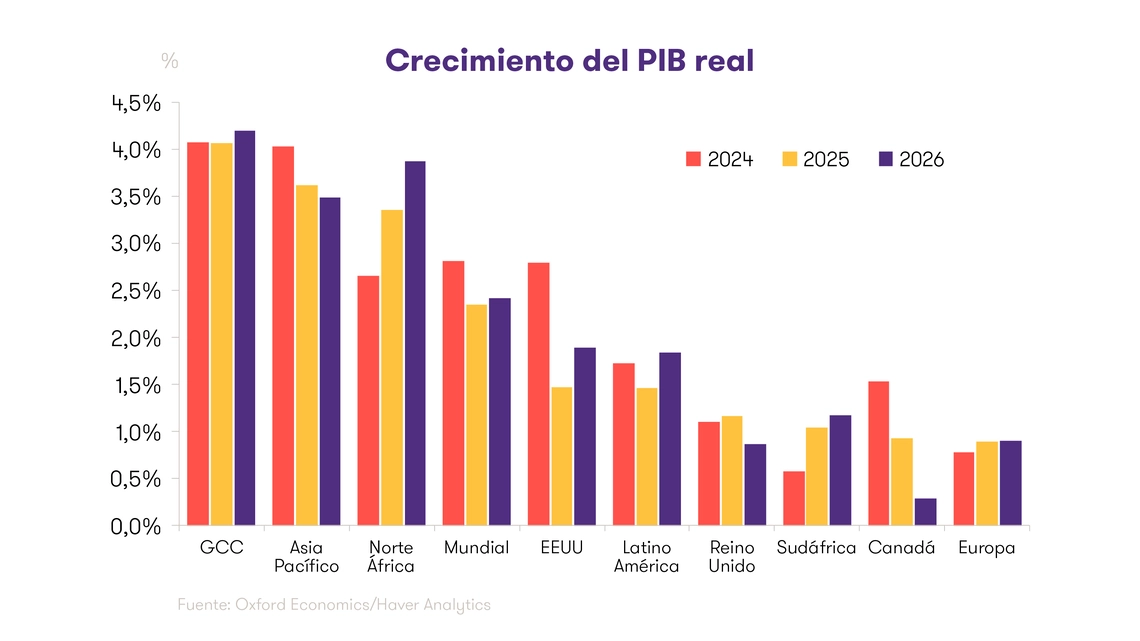 Las previsiones de crecimiento económico están condicionadas por la nueva batería de aranceles. Tal y como refleja el análisis de Oxford Economics, regiones como Norteamérica y Asia Pacífico se pueden ver muy afectadas por la evolución de la guerra comercial, mientras que otras regiones, como la Eurozona, el Norte de África o el Golfo Pérsico tendrán un impacto mucho más limitado.