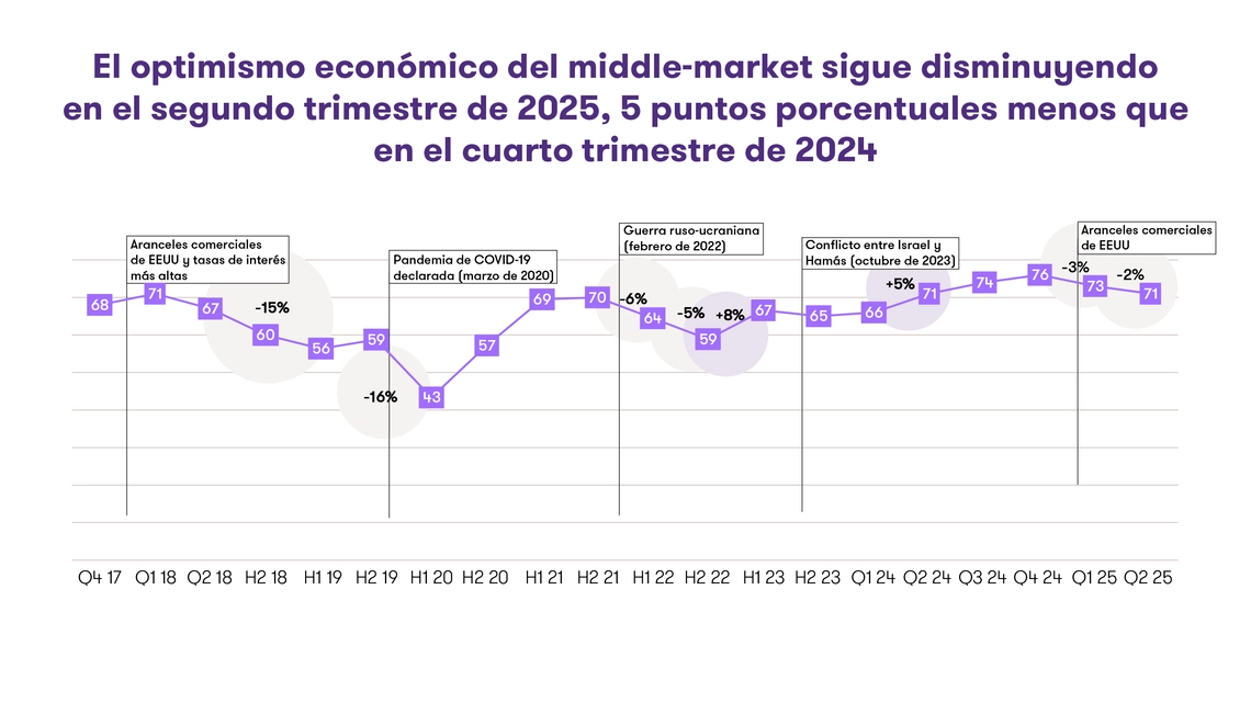 A nivel global, sin embargo, la inestabilidad del panorama global tiene más peso que las potenciales oportunidades que ofrecen los mercados nacionales. El International Business Report del segundo trimestre refleja una nueva caída del optimismo global de los empresarios del middle-market, que ha descendido 5 puntos porcentuales desde finales de 2024. No obstante, un 71% de los líderes de las empresas medianas se muestra aún optimista respecto a la evolución de la economía a corto plazo.