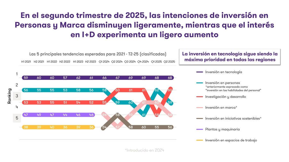 Las prioridades, en todo caso, varían en función del sector. La banca y el sector energético mostraron una mayor intención de invertir en talento humano durante el segundo trimestre del año y un menor foco en el I+D+i. Mientras, las compañías tecnológicas muestran mayor predisposición a la hora de invertir en su propia marca.