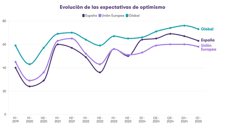 Pese al contexto complejo, el 58% de las compañías españolas espera aumentar sus ingresos en los próximos doce meses, aunque este dato representa un descenso de tres puntos frente al trimestre anterior y está en línea con la media de la UE. A nivel mundial, la cifra es más alentadora, con dos de cada tres empresas confiando en un incremento de sus ingresos.