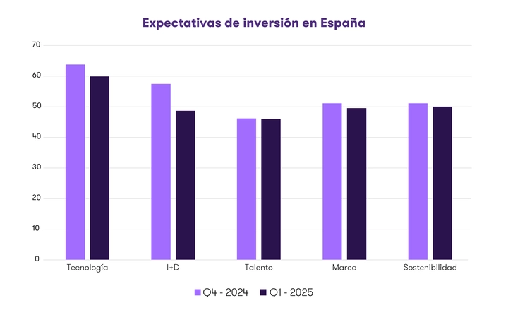 Las iniciativas sostenibles también pierden impulso, con un 50% de empresas con intención de invertir, un punto por debajo del trimestre anterior. En cuanto a la inversión en marca, también se registra una ligera caída de dos puntos, hasta el 49%, aunque se mantiene cinco puntos por encima del nivel de hace un año.