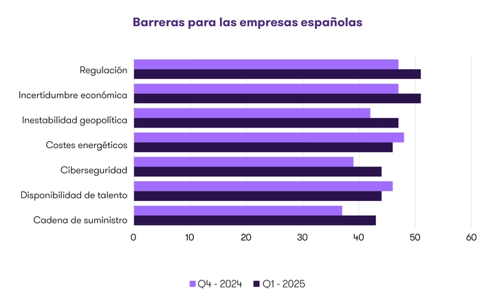 Las principales preocupaciones del empresariado español siguen centradas en el entorno regulatorio y la situación económica. Más de la mitad de las empresas españolas (51%) señalan las trabas normativas y la excesiva regulación como una barrera creciente para su actividad, un dato que ha aumentado cuatro puntos respecto al trimestre anterior y siete en comparación con el año pasado. Este temor se sitúa por encima de la media europea (47%) y a la par del dato global, que también ha experimentado un repunte.