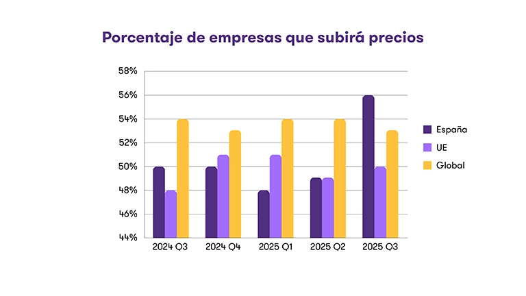 En esta edición, las expectativas de subir precios por parte de las empresas medianas han alcanzado el máximo histórico de la serie, elaborada desde 2011. Entre el segundo y el tercer trimestre, las expectativas de subir precios han crecido 7 puntos porcentuales en España, que además refleja una tasa más elevada en este indicador que el dato de la Unión Europea (50%) y el global (53%).