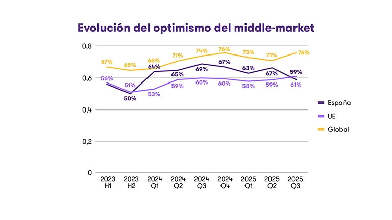 El porcentaje de directivos que considera que la economía mejorará en el próximo año se sitúa en el 59%, mínimos desde 2023. En el último año, el optimismo empresarial se ha desplomado diez puntos. Mientras tanto, en Europa se estabiliza, y marca máximos históricos a nivel global (75,7%); motivado por el resultado final de la guerra comercial la cual no ha sido tan crítica como parecía en un primer momento.