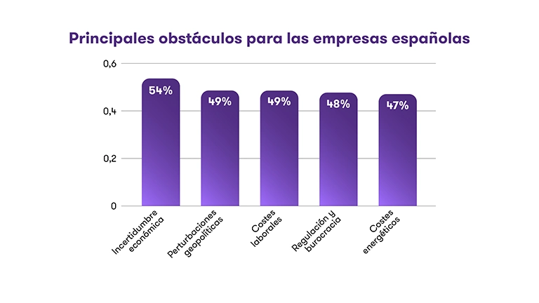 En este contexto, las empresas señalan como palancas críticas la estabilidad regulatoria y la calidad institucional. La percepción de la regulación y la burocracia como barrera al crecimiento aumenta hasta el 47,8%, a la par que ganan peso la incertidumbre económica (54%) y las perturbaciones geopolíticas (49%). El 42% de los empresarios reclama una mayor simplificación administrativa y burocrática.