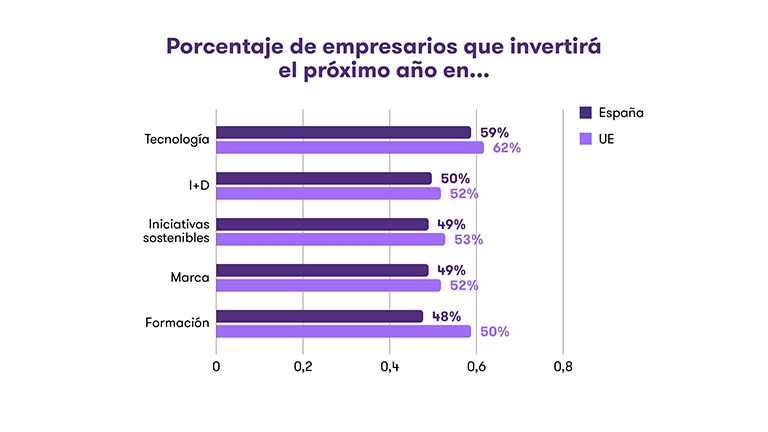 Pese a la inestabilidad, las empresas del middle-market mantienen una apuesta estratégica por la sostenibilidad, la innovación y la digitalización. El 60% de las compañías encuestadas mantienen su intención de llevar a cabo inversiones en digitalización, y el 44,4% en ciberseguridad.